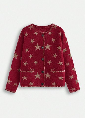 Цвет Бордовый / Узор Звезды / Фактура Вязаная / Застежка На пуговицах / Сезонность Демисезон / Материал Жаккард, Полиэстер / Состав 100% полиэстер