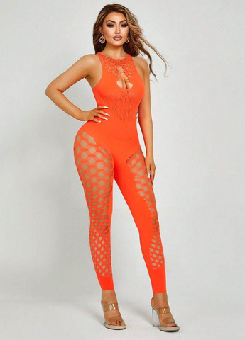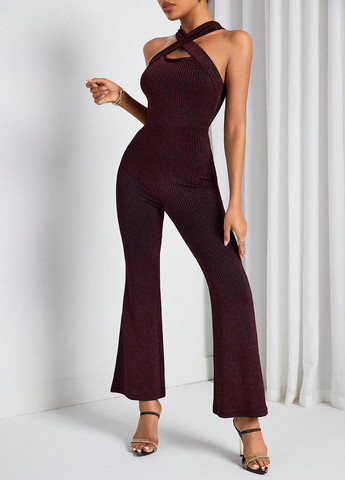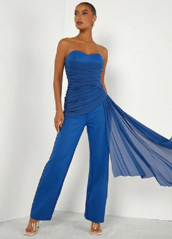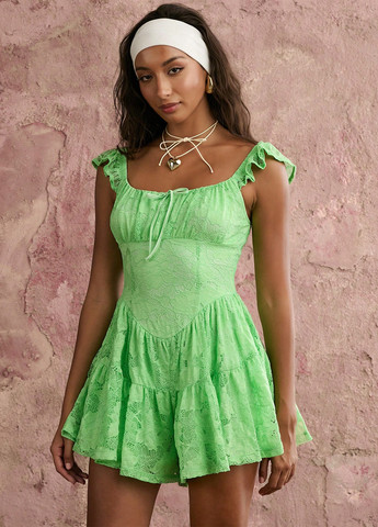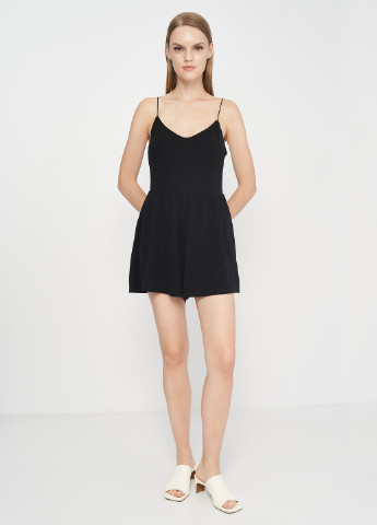 Комбинезон из блестящего трикотажа с тонкими бретелями. V-образный вырез горловины спереди, прямой крой сзади, отрезная талия на сборке. Низ короткий и прямой. Без подкладки.