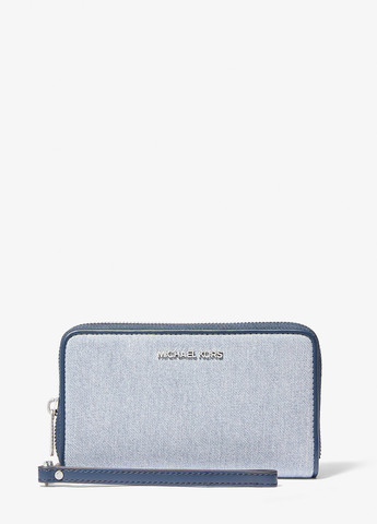 Женский кошелек Michael Kors. Стильный женский кошелек от Michael Kors из джинсового текстиля. Съемный ремешок для подвешивания на запястье, застежка на карабин. Карман для телефона. Один внутренний карман на молнии. Два отделения для купюр. Семь слотов для карт. Застегивается на молнию. Размеры: 17,5*10*3 см. Отличное качество.