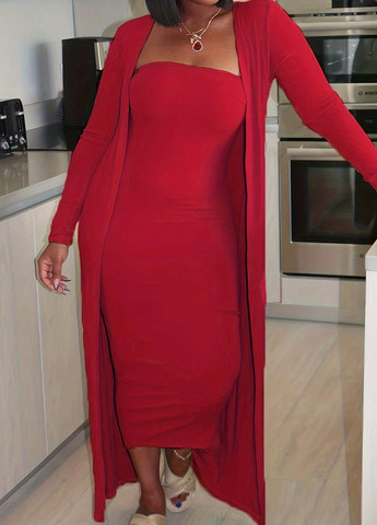 Женский повседневный длинный кардиган и платье-бандо. Этот комплект имеет облегающий крой. Ткань средней эластичности. Имеет стандартный рукав и вырез без бретелек.