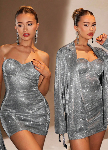 Gramine Glamine Luxurious Party Blazer Set. Этот комплект из двух частей состоит из свободного жакета и облегающего мини-платья. Жакет изготовлен из блестящей металлизированной ткани с блестящей отделкой. Платье имеет облегающий дизайн. Оно включает застежку-молнию и дизайн без спинки. В комплекте используется слегка эластичная ткань. Он имеет вырез без бретелек и ложные карманы.