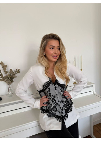 Изысканный женский костюм из Shovk Armani с кружевными вставками – это идеальное сочетание элегантности, роскоши и современного стиля. Комплект состоит из элегантного пиджака и классических брюк, которые вместе создают утонченный и женственный силуэт.