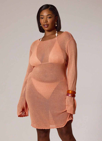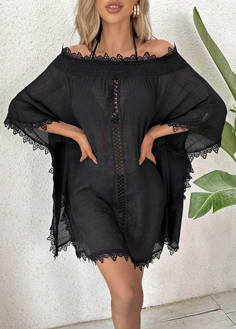 Летняя пляжная туника с открытыми плечами, разрезом на бедрах и кружевной отделкой. Она изготовлена из тканого материала, имеет полупрозрачный материал, рукава длиной три четверти и свободный крой.