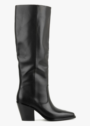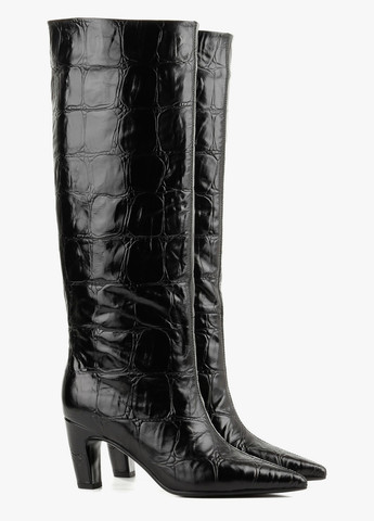 Высокие сапоги в классическом черном цвете излучают сдержанную элегантность и уверенность. Изготовленные из гладкой кожи, они имеют минималистичный дизайн, подчеркивающий утонченность силуэта. Металлический декор в виде тонкого ремешка с блестящей пряжкой придает изысканный акцент, не нарушая общей гармонии. Прямое голенище и небольшой каблук обеспечивают комфорт и стабильность в движении. Эта обувь — удачное сочетание классики и современности, подходящее как к офисным лукам, так и к повседневным образам в холодный сезон.