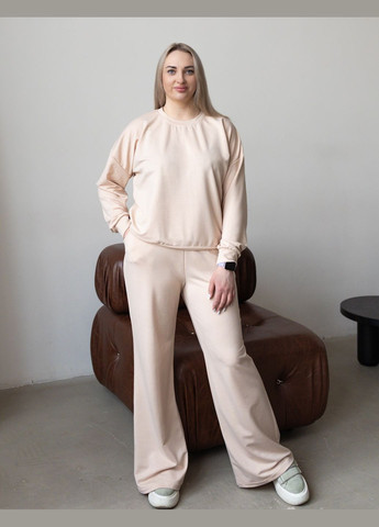 Повседневный брючный костюм-двойка – это одновременно фантастический вид и невероятный комфорт. Свободный свитшот со спущенным плечом, на манжете и эффектные брюки с клеш от бедра прекрасно садятся по фигуре. Универсальный кремовый цвет выглядит стильно и одновременно нежно, к тому же прекрасно подойдет к обуви и аксессуарам любых оттенков. Также для любителей пастельных цветов есть лавандовый, пудровый и персиковый. Те, кому нравится яркая гамма, оценят насыщенные коралловый и горчичный, а если необходимо что-то более практичное – идеально подойдет бордовый костюм. Ткань очень приятная к телу и практичная. Размеры: S, M, L, XL, 2XL