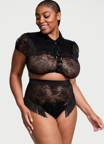Кружевной комплект Victoria´s Secret. Шикарный комплект, который состоит из топа и трусиков. Гладкая атласная отделка придает изюминки. Комплект также украшен бахромой и галстуком-боло. Кружевной топ с короткими рукавами и рубашечным воротником. Застегивается спереди на кнопки. Сексуальные трусики от Victoria´s Secret - хороший вариант для особых вечеров. Детали в форме сердца спереди и сзади. Высокая посадка. Хлопковая ластовица. Мягкая, комфортная и эластичная ткань. В комплекте есть мешочек для хранения. Отличное качество.