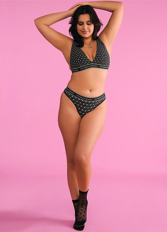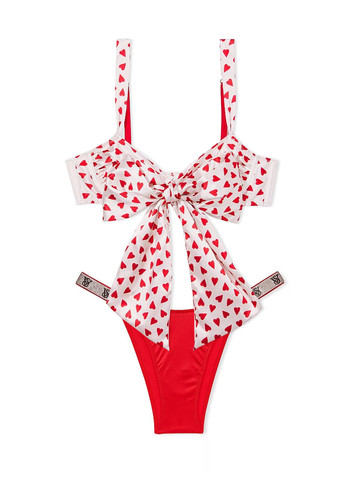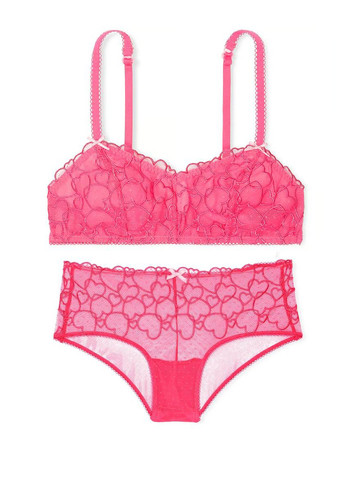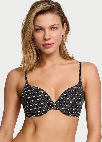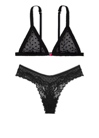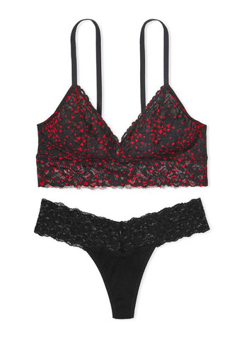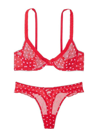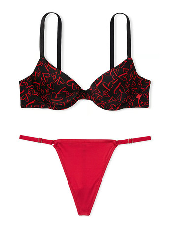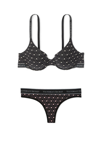 Женский комплект белья Victoria´s Secret. Лиф из приятной на ощупь ткани с уплотненной чашечкой. Бюст на косточках. Эластичная резинка под грудью с логотипом бренда для лучшей поддержки. Регулируемые бретели-трансформеры, отстегиваются сзади. Бретели с логотипом бренда контрастного цвета. Застегивается сзади на крючки. Трусики тонг Victoria’s Secret. Эти повседневные тонги с гладкой посадкой и повседневным комфортом, которые вам нужны, оснащены супермягкой смесью хлопка и модала и фирменным логотипом на поясе. Средняя посадка. Мягкий эластичный пояс с логотипом. Хлопковая ластовица. Комплект украшен принтом "сердца" и логотипом бренда. Отличное качество.