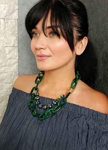Легкое пластиковое колье-воротничок di classe Италия в насыщенном изумрудном цвете – яркий акцент для вашего образа. Два ряда: массивная глянцевая цепь и ряд блестящих граненых бусин, придающих колье динамики и глубины. Длина около 49 см с возможностью регулировки благодаря застежке-карабину. Стильный и практичный аксессуар для casual луков, вечерних выходов и отпускного гардероба. Легкий материал делает украшение удобным для ежедневной носки без ощущения веса.