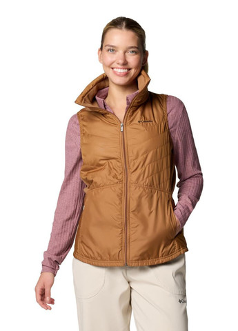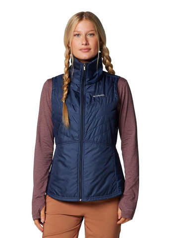 Женский жилет Columbia. Стильный жилет от Columbia, который сохраняет тепло. Жилет изготовлен из отталкивающей дождь и пятна ткани. Воротник-стойка с флисовой подкладкой обеспечивает необходимое тепло, а прилегающая к телу технология Active Fit обеспечивает дополнительную подвижность. Флисовые вставки по бокам. Два боковых кармана позволят вам держать все необходимое под рукой, когда вы в пути. Вышитый логотип бренда на груди. Отличное качество.