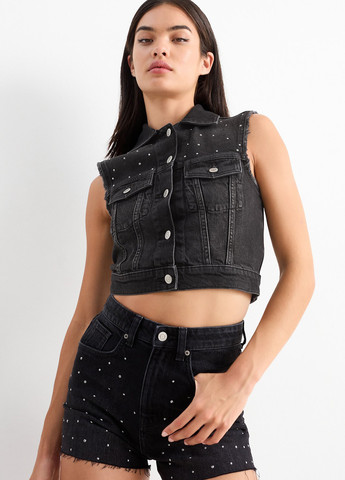 Женская демисезонная жилетка батал синяя с стразами средней длины с кулиской