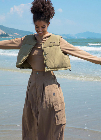 Жилет без рукавов цвета хаки имеет круглый вырез. Он имеет свободный крой и застегивается на молнию. Жилет изготовлен из неэластичной ткани.