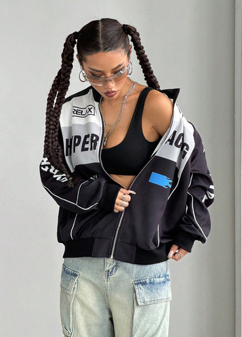 Женская куртка SHEIN EZwear Streetwear Graphics Padded Jacket. Эта черная куртка с бейсбольным воротником и длинными рукавами имеет свободный крой и стандартный подол. Куртка на подкладке. Застежка на молнию и детали из ребристой ткани. Эта куртка в уличном стиле подойдет для повседневной носки.
