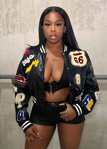 Женская куртка-бомбер BamGleam. Эта повседневная куртка-бомбер с бейсбольным воротником и спущенными плечами. Узкий подол и длинные рукава. Куртка изготовлена из искусственной кожи с лёгким тянущимся эффектом. Подходит для поздней осени (10-17°C). Только ручная стирка.