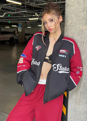 Эта куртка-бомбер рассчитана на свободный крой. Она имеет дизайн с цветовыми блоками красного и черного цветов. Куртка включает нашивки и карманы. Имеет рукав с заниженной линией плеча и бейсбольный воротник. Ткань средней эластичности. Включает однобортную планку.