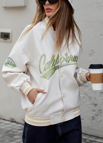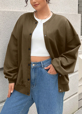 Куртка SHEIN EZwear Plus Varsity. Эта университетская куртка с бейсбольным воротником и рукавами реглан имеет стандартный подол и свободный крой. Куртка без подкладки. Застежка на пуговицы спереди, карманы отсутствуют. Идеально подходит для поздней осени (10-17°C/50-63°F). Машинная стирка или профессиональная химчистка.