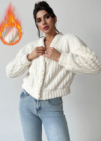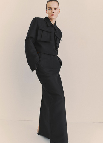 Жакет прямого силуэта, двубортный. Выполнен из плащевой ткани, наполнитель: тинсулейт 100 (г/м2). Воротник втачной с отложными лацканами. Рукав втачной, двухшовный. По полочке выполнены карманы с клапанами. Застёжка на кнопку. Подкладка: нейлон.