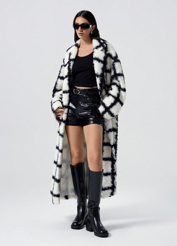 Женское пальто SHEIN EZwear – чёрно-белое. Это длинное пальто согреет зимой (ниже 10°C/50°F). Оно украшено чёрно-белым узором и имеет двубортный крой. Пальто дополнено поясом и длинными рукавами. Подкладка – 100% полиэстер. Ткань – смесь полиэстера, вискозы, полиамида, акрила и шерсти. Машинная стирка или профессиональная химчистка.