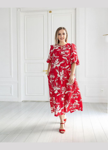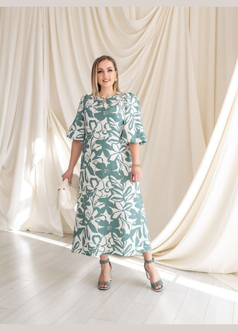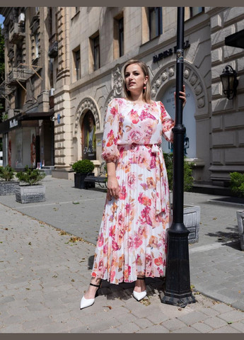 Платье отрезное по талии, длина - низкая миди. Талия на резинке, тянется. Лиф переда с фиксированным запахом и несъемными поясами, с талиевыми и нагрудными выточками. Лиф спинки с центральным швом на застежке - потайная ,,молния". Низ платья - солнце-клеш-гофре. Рукав 3/4. Модель очень хорошая, изящная, на любой тип фигуры, уместна и на праздник и на менее значимые события.
