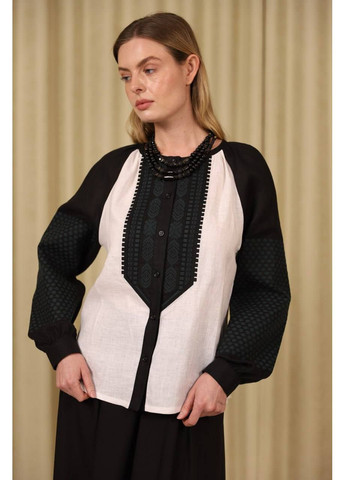 Женская вышиванка MOTYV "Полонина": 100% Лен и Этнический Стиль Представляем роскошную вышитую рубашку "Полонина" от украинского производителя MOTYV. Эта модель – воплощение элегантности и национальной традиции. Главные преимущества: Натуральный состав: Изготовлена из 100% льна – идеального материала для комфорта в теплое время года. Уникальный дизайн: Стильное сочетание основных цветов – черного и белого – с яркой акцентной вышивкой. Утонченная машинная вышивка крестиком и гладью в глубоких зеленых оттенках украшает грудь и рукава. Практичность: Рубашка имеет классический крой, застегивается на пуговицы. Эта вышиванка станет идеальной основой для создания торжественного, патриотического или стильного делового образа.