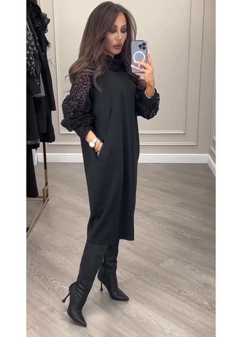 Особые декоративные элементы придают блеск: широкие манжеты рукавов украшены блестящим декором, что придает гламурному акценту, а разделение платья (низ) также украшено блестящим декором, создавая эффектный мерцающий край. Длина мини или меди (судя по фото, ближе к мини) подчеркивает стройность ног. Наличие пояса или тесьмы на талии (видно на фото) позволяет регулировать силуэт и подчеркивать талию, завершая этот непревзойденный образ.