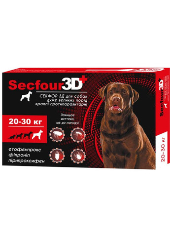 КАПЛИ ПРОТИВОПАРАЗИТАРНЫЕ для собак больших пород 20-30 кг Капли Secfour 3D мгновенная защита от паразитов еще до нападения! Три мощных уровня защиты благодаря 3 действующим веществам: этофенпроксу, фипронилу и пирипроксифену. Препараты уничтожают паразитов до укуса. Нокдаун эффект в течение 2 минут! Паралитическое действие препарата не позволяет клещу передвигаться животным и выбирать место для укуса. Гарантированная защита животного от инфецирования в течение 4 недель. Прекращает развитие популяции паразитов в стадии яйца и личинки. Профилактика и лечение собак и кошек при поражении эктопаразитом: блохами, волосоидами, вшими, иксодовыми, отодектозными, нотоэдрозными клещами, для отпугивания кровососущих двукрылых насекомых: слепней, мошек, мокрецов, москитов, зоотропных мух и профилактики. Безопасность для животных – действующие вещества не всасываются в системный кровоток. Эффективность – у паразитов нет привыкания к трехкомпонентной формуле. Действующие вещества: этофенпрокс 600 мг, фипронил 300 мг, пирипроксифен 60 мл. Срок действия: 4 недели. Назначение: профилактика и лечение собак при поражении эктопаразитом.