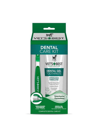 Dental Care Kit Набор Для Ухода за Ротовой Полостью (Гель Для Чистки Зубов + зубная щётка) Набор предназначен для ухода за ротовой полостью Вашего питомца. Зубная паста Dental Gel Toothpaste разработана для бережного удаления зубного налета и зубного камня, а также для освежения дыхания ротовой полости собак. Зубная щетка с тремя головками обеспечивает охват всей поверхности зуба и эффективное очищение со всех сторон. Уже более 30 лет Vet`s Best соединяет натуральные компоненты, создавая средства обеспечивающие комфорт и защиту для Вашего питомца. Обеспечивает гигиену ротовой полости Вашего питомца Бережно удаляет налет и зубной камень Придает белизну и яркость зубам Освежает дыхание Приятный для животных вкус и аромат Инструкция по применению. Выберите один из наиболее удобных для Вас способов: А. Применение щетки: для наилучших результатов, используйте щетку, входящую в комплект. При первом применении нанесите каплю геля на палец и дайте попробовать собаке. Затем, нанесите небольшое количество пасты на зубную щетку и начните с бережного очищения передних зубов, постепенно переходя к крайним. Поместите щетку так, чтоб зуб находился внутри треугольной щетки. Направляйте щетку вперед и назад, полностью охватывая всю поверхность зуба. Для наилучших результатов чистите зубы несколько раз в неделю. Средство безопасно при случайном заглатывании. Не требует ополаскивания после применения. Обеспечьте собаке свободный доступ к чистой питьевой воде. Б. Чистка зубов с помощью пальца. Нанесите пасту на палец, а затем с помощью пальца, нанесите пасту на зубы собаки. С. Контроль свежести дыхания: нанесите небольшое количество пасты на язык питомца. Состав: глицерин, алоэ вера, пектин, масло нима, экстракт косточек грейпфрута, пищевая сода (натрия бикарбонат), оксидаза глюкозы (ферменты), природные ароматизаторы. Данный продукт не предназначен для лечения или применения при различных заболеваниях или при ветеринарных показаниях.