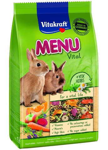 Меню Vital для взрослых кроликов является сбалансированным рационом, в составе которого вы найдете все необходимое для здоровой и продолжительной жизни вашего питомца. Корм содержит люцерну, богатую на волокна, ароматные яблоки, полезные злаки, вкусные овощи. Все необходимые Витамины, минералы и микроэлементы способствуют отменному состоянию вашего кролика. Много сырой клетчатки: сырая клетчатка улучшает пищеварение и поддерживает здоровую микрофлору кишечника. Зубы: богатый клетчаткой состав поддерживает необходимый для зубов процесс стачивания. Анти-запах: специальная комбинация из 3-х натуральных ингредиентов связывает неприятные запахи и уменьшает их образование. Не содержит сахара, ароматизаторов и искусственных консервантов Состав: продукты растительного происхождения (10.6% люцерны), злаки - 41.6%, овощи (тыква сушеная 1%), фрукты (яблоко сушеное 1%), минералы, растительные масла и жиры, экстракт юкки Шидигера, сырая клетчатка 14,0%. Добавки на 1 кг: Витамин А - 12773 МЕ, Витамин D3 - 981 МЕ, селен - 0.138 мг, железо - 44.24 мг, йод - 0.07 мг, медь - 5.93 мг, марганец - 15.19 мг, цинк - 20.95 мг. Рекомендации по кормлению: для карликовых кроликов старше 6 месяцев. В день около 45-55 г (4 ст. ложки) + сено + питьевая вода.Меню Vital для взрослых кроликов является сбалансированным рационом, в составе которого вы найдете все необходимое для здоровой и продолжительной жизни вашего питомца. Корм содержит люцерну, богатую на волокна, ароматные яблоки, полезные злаки, вкусные овощи. Все необходимые Витамины, минералы и микроэлементы способствуют отменному состоянию вашего кролика. Много сырой клетчатки: сырая клетчатка улучшает пищеварение и поддерживает здоровую микрофлору кишечника. Зубы: богатый клетчаткой состав поддерживает необходимый для зубов процесс стачивания. Анти-запах: специальная комбинация из 3-х натуральных ингредиентов связывает неприятные запахи и уменьшает их образование. Не содержит сахара, ароматизаторов и искусственных консервантов Состав: продукты растительного происхождения (10.6% люцерны), злаки - 41.6%, овощи (тыква сушеная 1%), фрукты (яблоко сушеное 1%), минералы, растительные масла и жиры, экстракт юкки Шидигера, сырая клетчатка 14,0%. Добавки на 1 кг: Витамин А - 12773 МЕ, Витамин D3 - 981 МЕ, селен - 0.138 мг, железо - 44.24 мг, йод - 0.07 мг, медь - 5.93 мг, марганец - 15.19 мг, цинк - 20.95 мг. Рекомендации по кормлению: для карликовых кроликов старше 6 месяцев. В день около 45-55 г (4 ст. ложки) + сено + питьевая вода.Меню Vital для взрослых кроликов является сбалансированным рационом, в составе которого вы найдете все необходимое для здоровой и продолжительной жизни вашего питомца. Корм содержит люцерну, богатую на волокна, ароматные яблоки, полезные злаки, вкусные овощи. Все необходимые Витамины, минералы и микроэлементы способствуют отменному состоянию вашего кролика. Много сырой клетчатки: сырая клетчатка улучшает пищеварение и поддерживает здоровую микрофлору кишечника. Зубы: богатый клетчаткой состав поддерживает необходимый для зубов процесс стачивания. Анти-запах: специальная комбинация из 3-х натуральных ингредиентов связывает неприятные запахи и уменьшает их образование. Не содержит сахара, ароматизаторов и искусственных консервантов Состав: продукты растительного происхождения (10.6% люцерны), злаки - 41.6%, овощи (тыква сушеная 1%), фрукты (яблоко сушеное 1%), минералы, растит