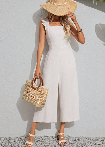 Комбинезон имеет квадратный вырез и модель без рукавов. Он изготовлен из неэластичной ткани. Общий стиль – стандартный.