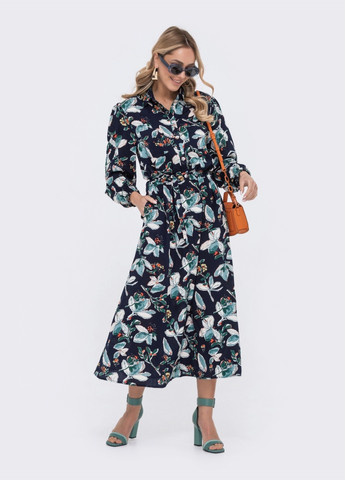 Принтованное платье-рубашка с юбкой колокол. Изделие с отложным воротником. Дополнено прорезными карманами на полочке и шлёвками для пояса на талии. Рукава на резинке. Для удобства в носке предусмотрены скрытые карманы. Застёгивается на пуговицы. Пояс в комплекте <p style="margin: -15px 0 15px 0;">На модели представлен 44 размер. длина изделия – 132 см; длина рукава (от плечевого шва) – 60 см.