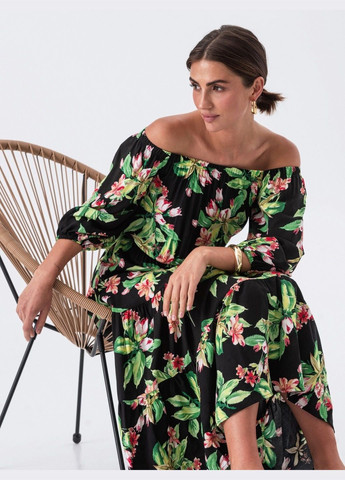 Стильное платье из штапеля. Горловина выполнена резинкой, что позволяет открыть плечи, так и прикрыть их. Рукава ¾ с манжетами в виде резинки. Талия с эластичной деталью, для комфортной посадки по фигуре. Подол дополнен воланом. Замеры изделия в 44 размере: длина по спинке – 124 см. длина рукава – 40 см.