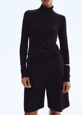 Короткий кардиган из двусторонней пряжи с добавлением мохера и шерсти. Небольшой воротник-стойка и планка с потайными кнопками спереди. Очерченные, слегка спущенные плечи с фигурными секциями и косыми швами. Удлиненные рукава и слегка вывернутые вперёд боковые швы, заканчивающиеся коротким разрезом. Ребристая отделка манжет и нижнего края.