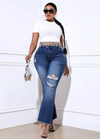 Эти расклешенные женские джинсы большого размера имеют средний цвет стирки, завышенную линию талии и стандартную посадку. Стиль включает потертые дыры, потертый край, выстиранный деним и необработанные детали подола. Они имеет застежку-молнию и карманы для дополнительного удобства. Доступны в удлиненной длине, идеально подходят для поздней осени.