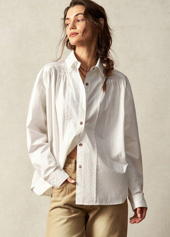 Эта рубашка имеет свободный крой. Она включает в себя воротник рубашки и рукава с приспущенным плечом. Изготовлена из неэластичной ткани и имеет обычный подол. Она имеет однобортную планку.