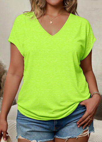 Женская футболка SHEIN LUNE неоново-зелёного цвета. Удлинённая футболка с V-образным вырезом и короткими рукавами. Изготовлена из трикотажного полотна на основе полиэстера и эластана. Футболка имеет классический крой и слегка тянется. Рекомендации по уходу: машинная стирка, не подвергать химчистке.