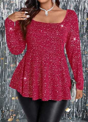 Топ Shein размера плюс с длинными рукавами и оборками по краю. С пайетками и расклешенным краем. Изготовлен из эластичной ткани.