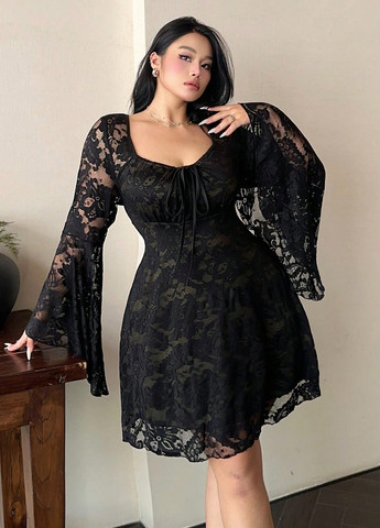 Элегантное черное платье. Имеет вырез в форме сердца и расклешенные рукава. Платье имеет завышенную талию и приталенный крой.