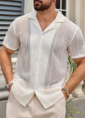 Повседневная мужская фактурная рубашка с коротким рукавом и застежкой на пуговицы. Рубашка имеет стандартный рукав и подол. Рубашка слегка тянется.