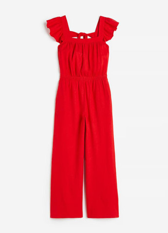 Комбинезон свободного кроя до лодыжки из льняно-вискозной смеси. Квадратный вырез горловины со складками спереди, узкой резинкой и широкими горизонтальными завязками сзади. Плечевые бретели с оборками, закрытая резинка на талии, незаметные карманы в боковых швах и прямые штанины.