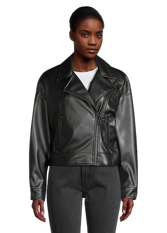 Куртка DKNY. Стильная куртка из экокожи. Застегивается спереди на косую молнию. Рубашечный воротник. Длинные рукава с манжетами на пуговице и молнией. Спереди три накладных кармана на молнию, два из них боковые.  Очень мягкий и приятный на ощупь материал. Есть подплечники. Отличное качество.