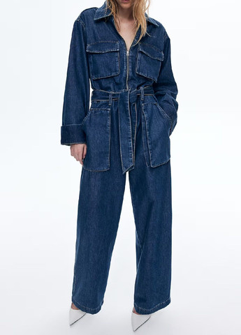 Комбинезон из жесткого денима с воротником, молнией спереди и кокеткой сзади. Заниженная линия плеча, длинные рукава с манжетами и съемный пояс на талии. Нагрудные карманы с клапанами, накладные передние карманы и открытые задние карманы.