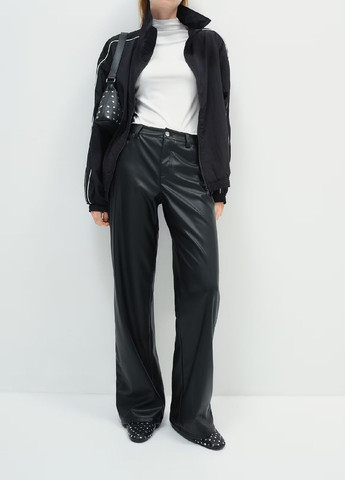 Брюки свободного покроя из ткани с покрытием. Ширинка на молнии и пуговице, передние и задние карманы, прямые брючины.