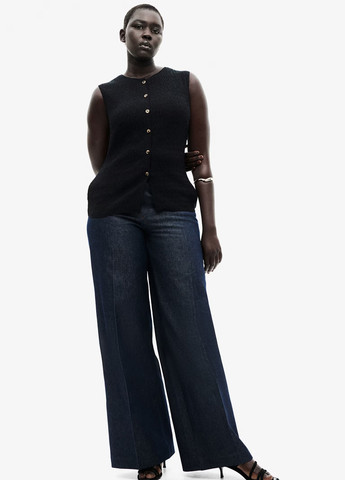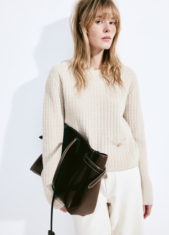 Приталенный жилет из мягкой вязки с мохером и шерстью. Без рукавов. Шальковый воротник с туннельным низом и отверстием для протягивания нити из другого конца. Узкое ребристое деление.