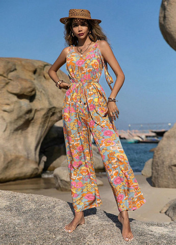 Комбинезон из денима имеет облегающую посадку. Он имеет узкие штанины и вырез-халтер. Комбинезон имеет открытую спинку и застежку-узел. Молния спереди обеспечивает удобство ношения. Ткань – деним средней эластичности. Он разработан для естественной посадки по средней линии талии.