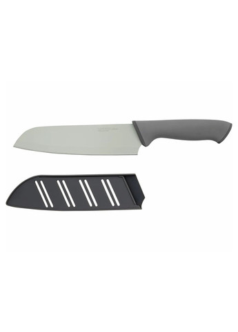 Нож сантоку — это универсальный кухонный инструмент родом из Японии, предназначенный для ежедневного использования. Название переводится как «три добродетели», что символизирует способность одинаково хорошо нарезать мясо, рыбу и овощи. Этот нож имеет широкое, слегка закругленное лезвие, что позволяет делать точные, ровные срезы. Лезвие длиной 17,5 см изготовлено из нержавеющей стали и покрыто антипригарным слоем ILAG®, благодаря чему продукты не прилипают во время работы. Эргономичная ручка обеспечивает удобство в использовании, а защитный чехол — безопасное хранение. Подходит для посудомоечной машины. Общая длина примерно 30 см. Производитель Германия.