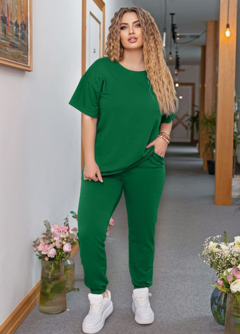 Костюм-тройка с цветочным принтом. В комплекте: футболка свободного кроя с круглым вырезом и принтом розы, однотонные брюки и кардиган с цветочным принтом с накладными карманами. Ткань: софт