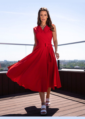 Летнее офисное платье-тренч с горловиной на запах и классическим английским воротником. Платье из красного софта с приталенным кроем и расклешенным медным низом длины. Модель без рукавов комплектуется съемным поясом. Полуобхват: Грудь: S(45), M(47), L(49), XL(51), Талия: S(35), M(37), L(39), XL(40), Бедра: S( 78), M(80), L(82), XL(84), Длина изделия - 114, Ткань: Низкая эластичность.