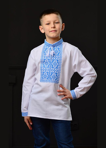 Вышиванка для мальчика синего цвета с белым цветочным орнаментом от vishivano4ka. Вышивка – машинная крестиком. Узор расположен на груди и манжетах. Дополняют рубашку кисти белого цвета на горловине. Стильная рубашка для любого события.