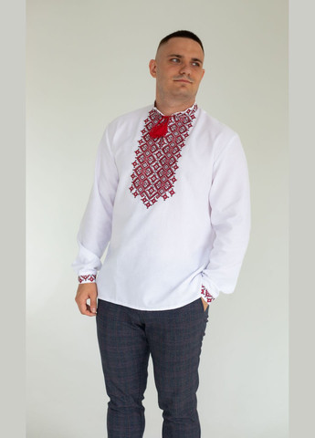 Традиционная белая мужская вышиванка от vishivano4ka на домотканом полотне с вышитым орнаментом. Модель свободного кроя с воротничком-стойкой, неглубоким вырезом с завязками-кутасиками, длинными просторными рукавами с манжетами на застежке. Рубашка украшена красно-коричневым геометрическим узором.