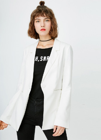 Пиджак темно-синего цвета изготовлен из текстурированной ткани, что придает ему выразительный вид. Он имеет классический крой с двумя пуговицами, а также два округлых накладных кармана внизу и один накладной карман на груди с левой стороны. Рукава пиджака украшены четырьмя декоративными пуговицами на манжетах.