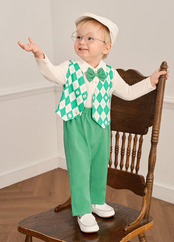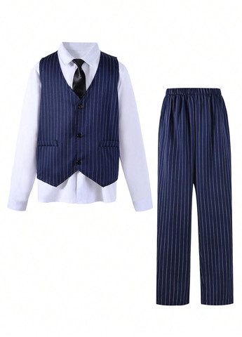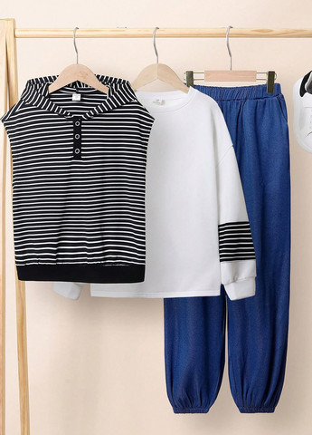 Этот комплект из трех предметов для мальчиков-подростков выполнен в повседневном стиле: жилет с капюшоном и свитшот в полоску, брюки. Свитшот включает в себя эластичные манжеты. Имеет свободный крой и стандартные рукава. В комплект также входит карман, застежка на пуговицах и лоскутный дизайн.
